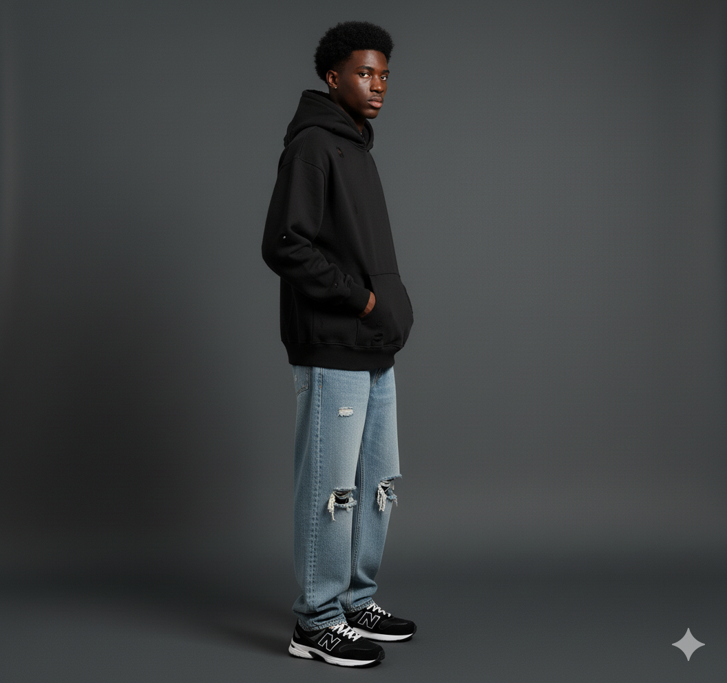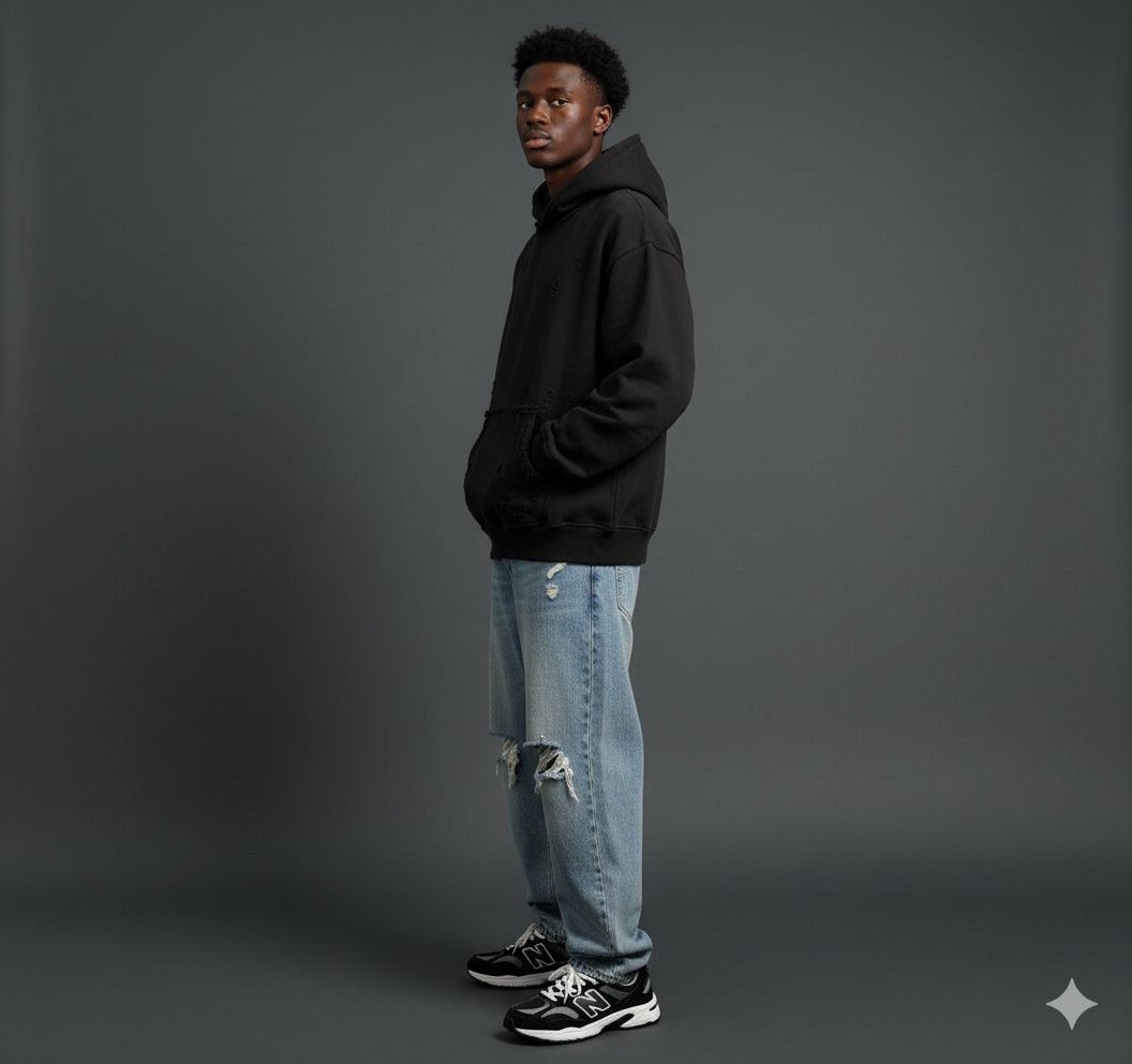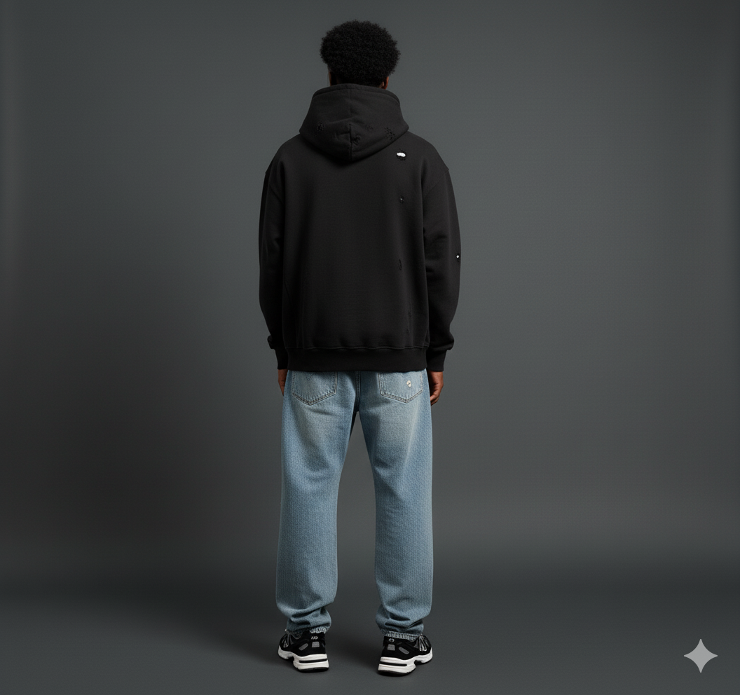 A Black Distress Oversized Hoodie built from upgraded 480 GSM heavyweight cotton for a premium feel and lasting durability. Designed with drop shoulders and a relaxed fit, this one-of-one distressed piece balances comfort with a street-inspired silhouette.