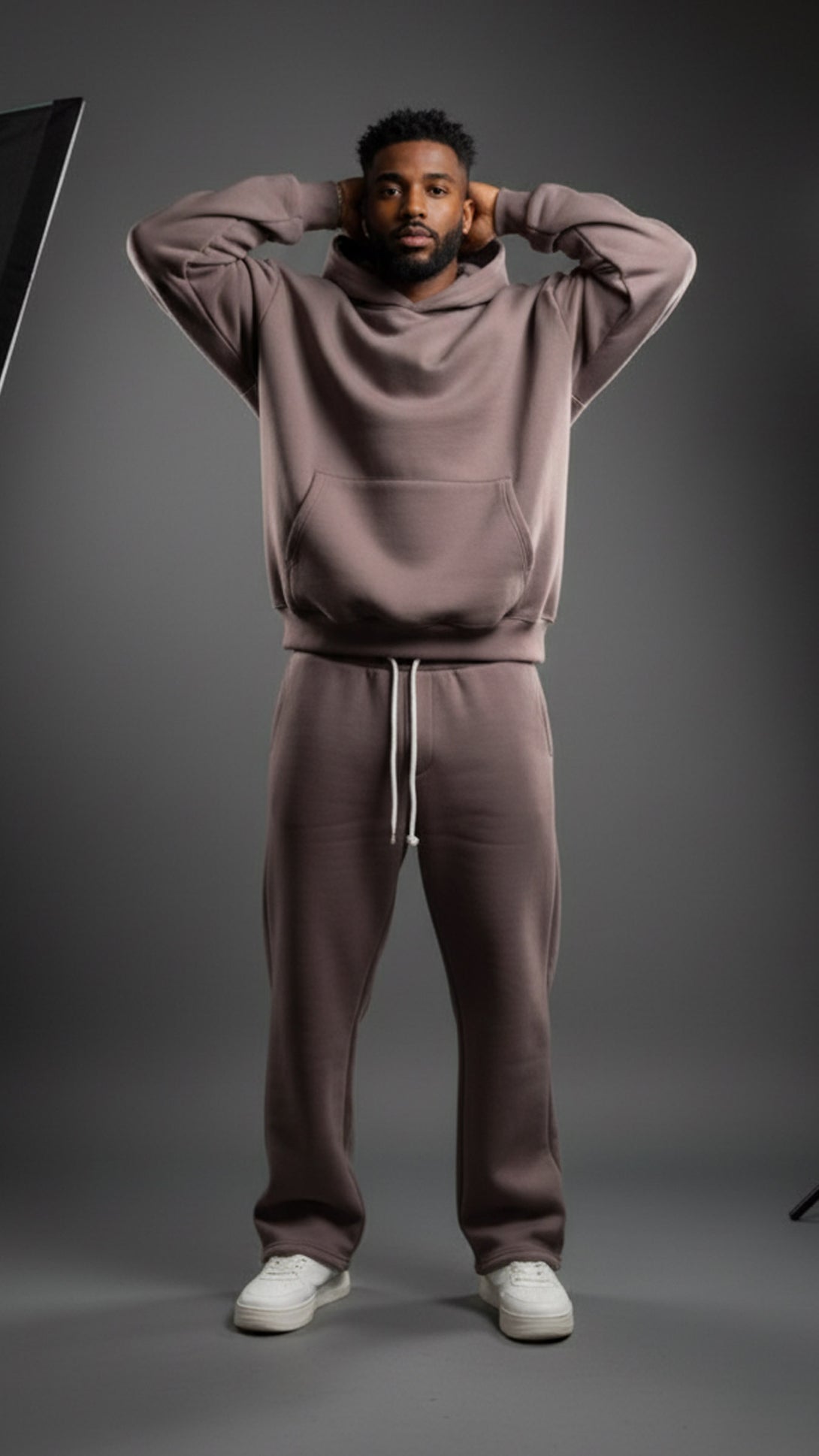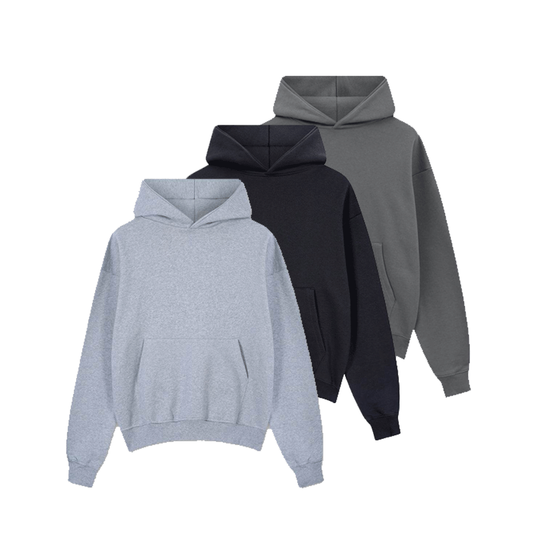A Oversized Bundle Three colors Hoodies (Warm Grey, Black , Heather Grey) crafted from upgraded 480 GSM heavyweight cotton for a premium feel and lasting durability. Featuring a relaxed, street-inspired silhouette with drop shoulders and baggy sweatpants for a complete look that combines comfort and style.