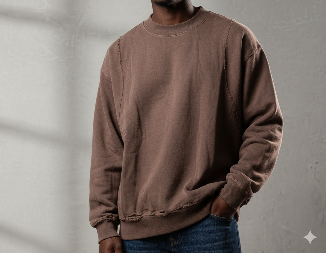 A Mocha Distress Oversized Sweatshirt built from upgraded 480 GSM heavyweight cotton for a premium feel and lasting durability. Designed with drop shoulders and a relaxed fit, this one-of-one distressed piece balances comfort with a street-inspired silhouette.