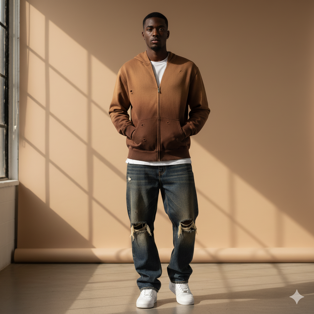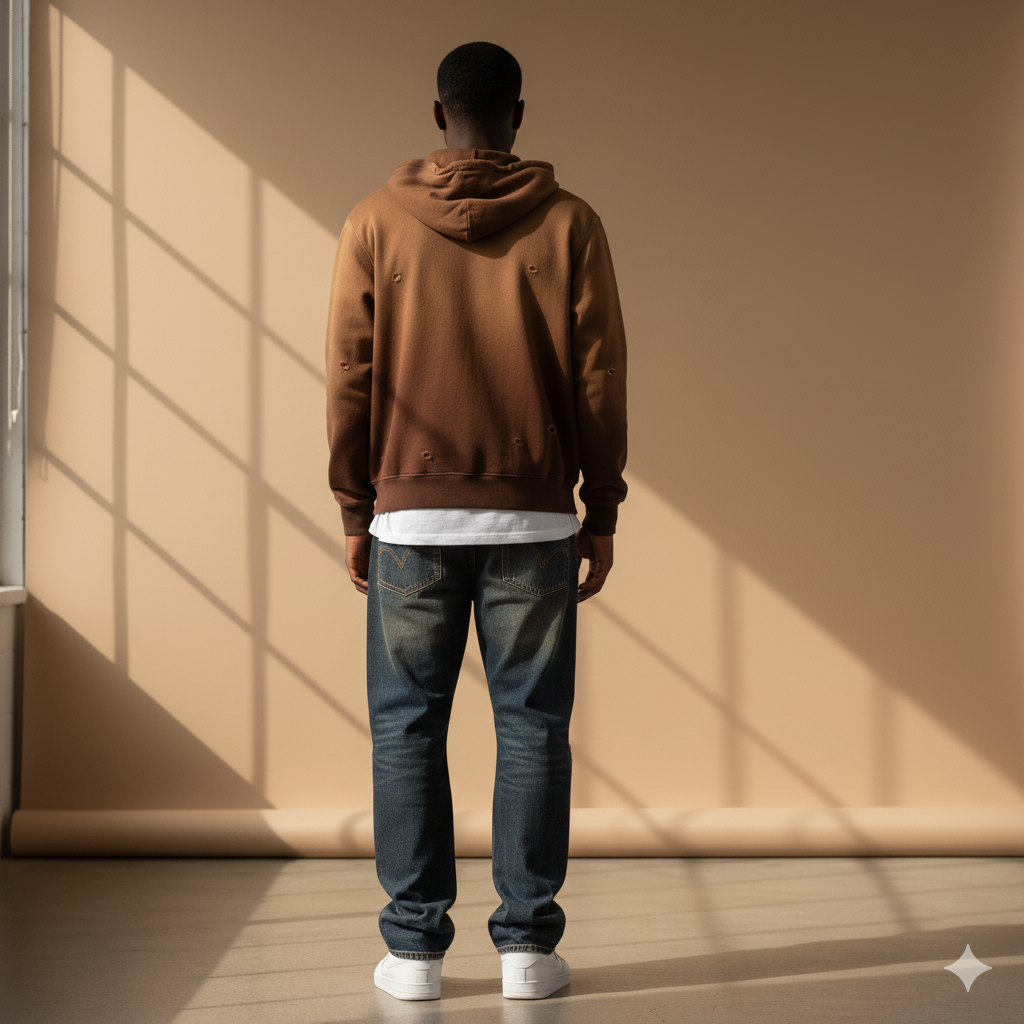 A Mocha Sun fade Distress Oversized Hoodie built from upgraded 480 GSM heavyweight cotton for a premium feel and lasting durability. Designed with drop shoulders and a relaxed fit, this one-of-one distressed piece balances comfort with a street-inspired silhouette.